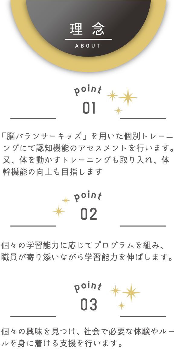 当事業所は、お子様一人ひとりの個性を大切にし、日常生活の基本や集団行動などを職員と一緒に学んでいきます。また、一人ひとりにあった療育プログラムを通し、新しい発見を共に目指します。